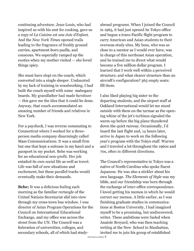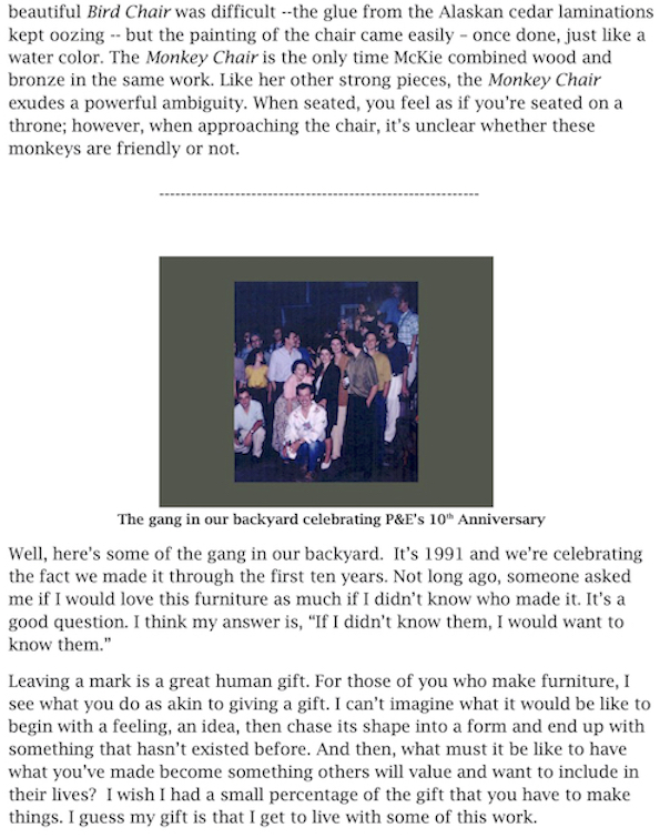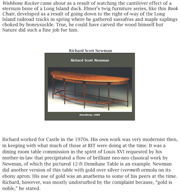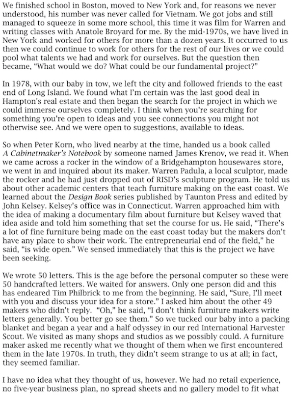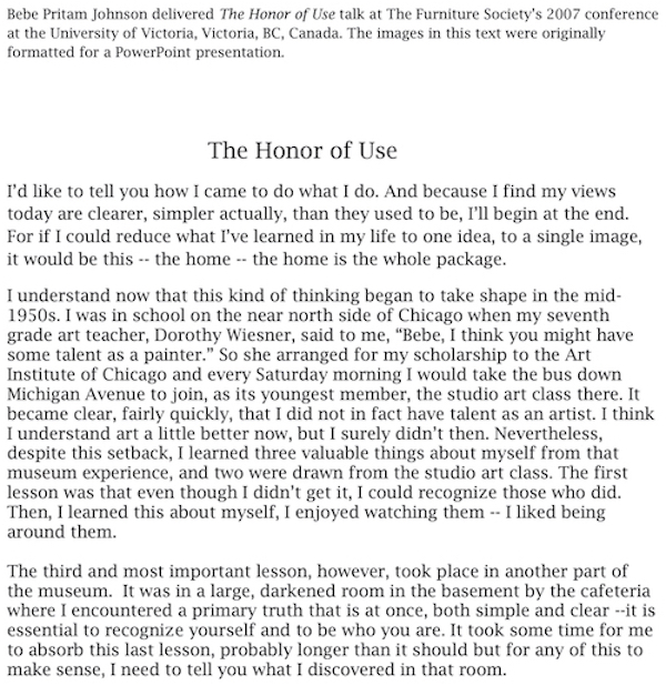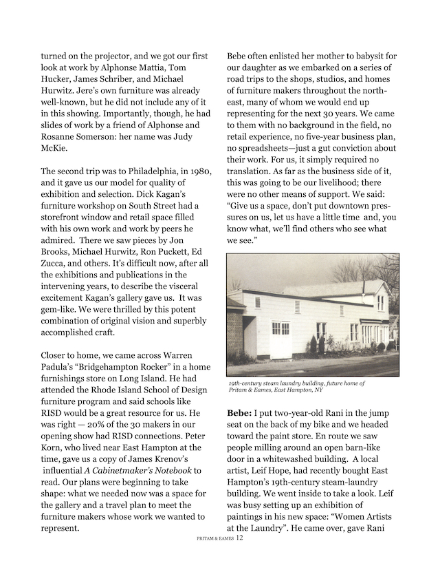The following text is the original version of Chapter 15, "Stepping Stones", in the book Speaking of Furniture. Bebe Pritam Johnson, Warren Eames Johnson. Speaking of Furniture: Conversations with 14 American Masters. (New York, London, Hong Kong: The Artist Book Foundation, 2013.)