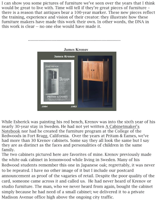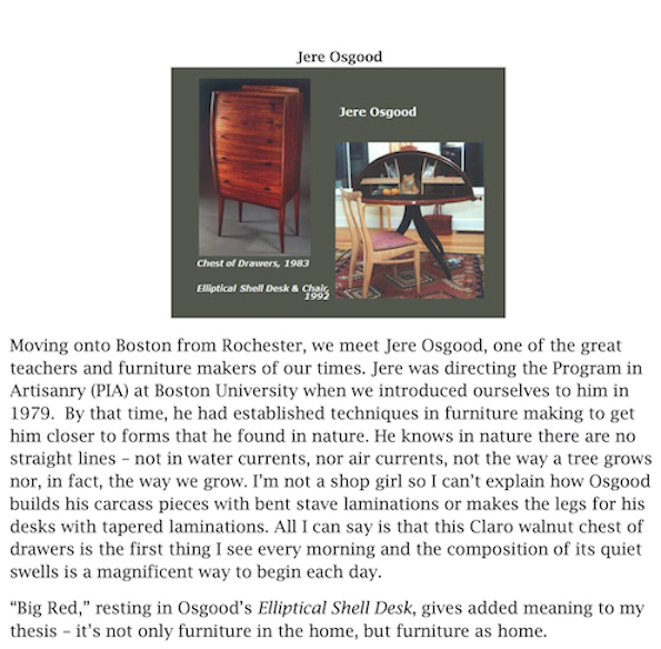 Personally, I can't imagine anyone more deserving of the Award of Distinction than Bebe Pritam Johnson and Warren Eames Johnson. They built and crafted a business that has sustained them, given a boost to grateful makers, and played an important part in building the dialogue that underpins today's studio furniture movement.