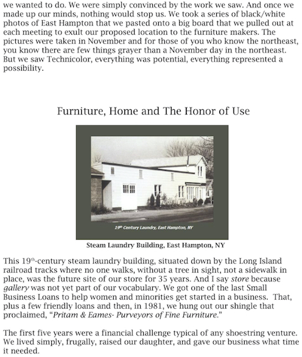 So, following the likes of De Kooning, Pollack and Larsen, they decamped to East Hampton, a bit before the glitterati of the ‘80s and ‘90s and, in another turn of career, carved out a life dedicated to craft: educating and offering to the public -- a public that sought them out in a historic old steam laundry building in East Hampton that became Pritam & Eames -- an opportunity to acquire and live with this work. For the last 33 years, Pritam & Eames has existed, both powerfully and quietly, out in Long Island for a very appreciative public.