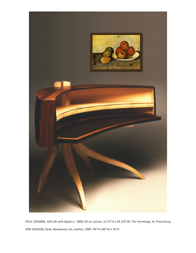 For example, a pairing could include Jere Osgood’s rosewood and ash desk and a Paul Cézanne still life. Why Osgood and Cézanne? Because their quests have much in common. Although separated in time by nearly a century as well as their chosen mediums, both Osgood and Cézanne sought in their work to go beyond the appearance of things, both struggled to arrive at a truth about the structure of organic form.