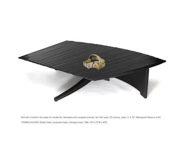 Hucker is deeply affected by Japanese aesthetics and Japan’s material culture especially objects related to the tea ceremony. As such, his furniture thinking often plays with opposites: poverty and elegance; mass and buoyancy, city and country; transparency without glass. Some of these formal constructs found their way into the making of the black slatted table. The top is an elevated plane that floats above the ground, and the lacquer of the top suggests the shimmer of the “heaven board” while the view through the negative space of the slats reinforce the “earth board.”