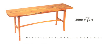 The poster announcement for the 20th anniversary show in 2001 forecasts, by and large, the next decade for the gallery. That is, the furniture makers who contributed to the 20th anniversary exhibit will continue to showcase their work at Pritam & Eames. Some fields seem conducive to longevity, and there must be a truthful aspect to this found in the furniture shop, despite its obvious hazards. Looking to the third decade requires that we imagine artist-gallery relationships that will endure for 30 years.