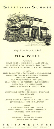 Binzen continued: "Early this summer, when Pritam & Eames mounted a 20th anniversary exhibition, the gallery was crowded with furniture by many of the most accomplished and active makers. Of the 26 included in the show, more than half were veterans of the inaugural exhibit. The greatest strength of this year's show was its breadth. With work by Judy Kensley McKie, Jere Osgood, Kristina Madsen, Alphonse Mattia, Hank Gilpin, Wendy Maruyama, David Ebner, Rosanne Somerson, Michael Hurwitz, James Schriber, and other distinguished designers, a furniture historian could easily have conducted a stirring seminar on the recent history of the craft (East Coast division, primarily) without recourse to anything but the pieces on display."