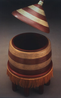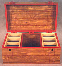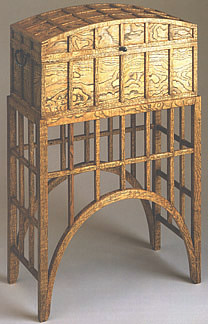 The jewelry box from Robert Ingham represents the first of a series of complex small cases to come from this English maker. Ingham had already spent many years in charge of studio production at Parnham House under the direction of John Makepeace. The Modrian-style linear graphics of the aesthetic of this box give it a different look from anything happening in the American furniture scene at this time. The delicate use of handmade hinges and distinct materials makes one think of Krenovian touches, although the strict geometry of the box would be at odds with this comparison. His use of color, in this case red dyed sycamore, expresses more of the freedom of American thinking. This strict geometry is nicely balanced by the very active, organic figure of the olive wood. Ingham explained that his own personal workplace at the school was not large, and he had learned to develop intricate highly controlled techniques that were aimed at constructing these case pieces.
