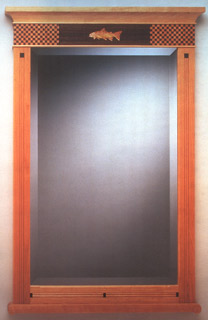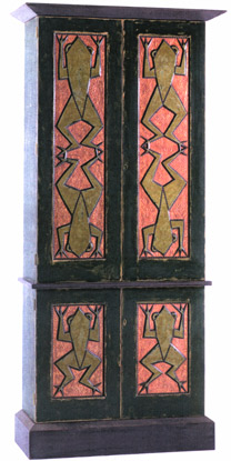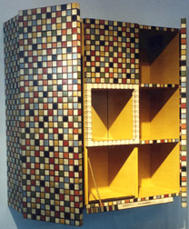 The two largest pieces in the show were a tall chest of drawers and a tall freestanding cabinet. The chest of drawers suggests a pyramid construction in that the four large bottom drawers each step in successively from the base. This stack of four drawers itself provides a base for the top tower of ten drawers and door. This piece is distinguished by the colored monotypes under glass that compose the drawer fronts. The diamond pattern of the monotypes, intentionally irregular, is reminiscent of the expressive dynamic of flag graphics. The reds, orange, and pale blues all with a light field grinning through make the colors seem weathered. The pediment and top molding are without gesture and simply frame this stack of drawers.