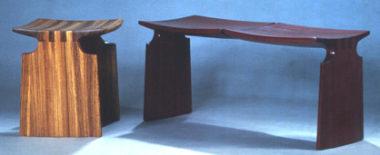 One way in which American crafts have been changing is in the direction of art; this has been visible in glass blowing and ceramics for some time. In the case of furniture, the evolution raises some fascinating questions about the relationship between craft and art, between the usual function of furniture and the individual creativity of the furniture maker, and between art and utility. Does one plump down into a studio chair, or merely admire it? If it is a work of art, is it still a chair?" |