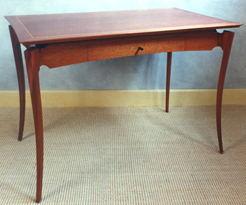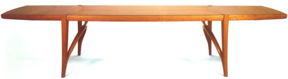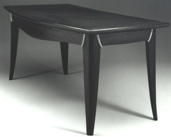 The downward curved surface of the apron supports and reinforces the curves found in the legs. With unusual perception, Walker combines the tailored aspect of precise intersections with the flowing and biomorphic quality of his curves. The apron also gives the top a dimension of depth and solidity.