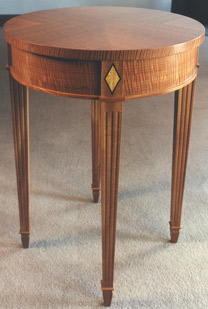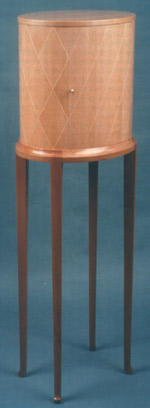 Paul Harrell, an experienced maker in his own right by this time, has in this case offered a stationery box that also closely reflects the thinking of Krenov. Zivko Radenkov’s elm and satinwood cabinet is his first attempt at the oval form since his perfectly rendered 1986 cabinet. The personality of this cabinet, however, is bolder and thus champions of the first oval cabinet might not be as taken with the second. It is slightly larger, and the marquetry is less restrained. Also, the satinwood field has a luminescence that makes one think of Louis XIV, rather than the almost Zen-like restraint of the earlier cabinet.