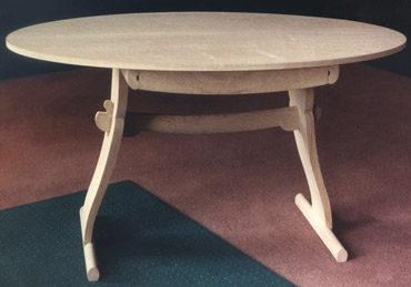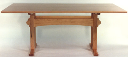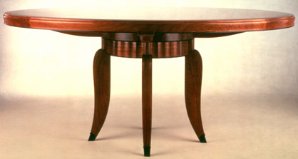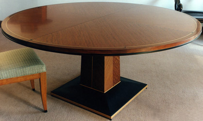Walker's table establishes certain features that he will continue to use in future dining tables. Each one will have beautifully decorated surface created by sequential band-saw cuts of unusually thick veneer. The advantage of this veneer process is that it allows the best use of the most beautiful wood but, by being unusually thick, (1/8”), it also provides opportunity to refinish a daily used surface without fear of going through a delicate veneer.