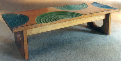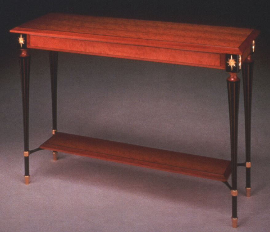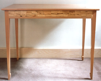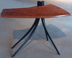 Every accomplished maker creates work that comes to be seen as his or her signature piece. For Walker, the bubinga sideboard or console is one such piece, and one well remembered by gallery visitors. Within Walker’s body of work, it is unusually sculptural. The boat shaped volume of its top has less to do with functionality, although it does house two narrow drawers, and has more to do with form: in this case, a streamlined and water borne volume floating serenely above its supporting table base. The curve of the rail of this table base strengthens the form, suggesting surface tension and buoyancy. The same curve is nicely reversed to add visual tension in the lower stretcher, which runs lengthwise between the legs. This piece again reflects more the quality of Saarinen’s work and less traditional table architecture. The single tonal drama is produced by a maple veneer rectangle that is centered on the top.