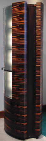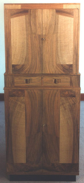 NOTES: The rosewood lingerie chest by Greg Smith needs to be highlighted here. Once again he accomplishes a beautiful piece with impeccable craft. The calligraphic pulls in forged iron demonstrate a second mastered skill by Smith. The stepped back effect as the piece ascends motivates the descending scale of the drawers. Three jewelry drawers behind the doors are half cabinet width.