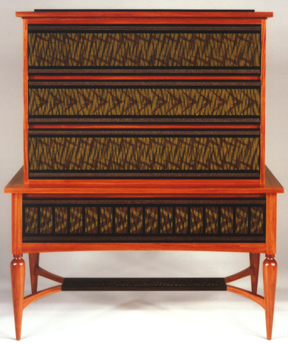 Of the pieces represented on the poster, Jere Osgood's Shell Desk 2001 and Brian Newell's Spider Cabinet certainly dominate as far as accomplishment. The carcass of Osgood's desk sits like a finely domed helmet atop one of his classic pedestal bases. The only interruption to the sections of vertically flowing Macassar ebony is the bottom centered pulls of the two doors. They sensually mirror the parting of the pedestal legs. The interior design of four drawers and curving partitions has the serene architecture of a cathedral interior.