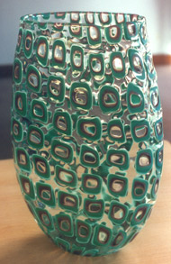 The small chest from Judy McKie represents one of her non-sculptural works with its emphasis on two-dimensional pattern. The pattern itself strikes you as large for the chest, and its two dimensionality seems only technical as the grid itself offers the focus of different shapes on different views, some pushing out from the plane, others imploding. The wild and primitive nature of the grid gives this piece almost a fun house, or circus, feel. The use of color helps to illustrate the dynamics of the shapes but is kept to muted, almost faded tones, as if this chest were found in an exciting exploration of the attic.