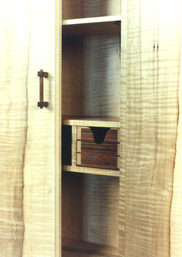 Walker’s Silver Cabinet or sideboard was another candidate to steal the show. In this piece, he looks back to his 1987 sideboard in ash that set the theme for his affection for long, chest-high cabinets that sit on a delicate, elegant table base and whose legs seem improbable supports for the cabinet mass they carry. In the 1987 piece, Walker used a double horizontal stretcher at the top of the legs to create structure with no lower leg stretchers. Here, too, he follows this formula of simple, uncluttered elegance where everything depends on the joinery at the legs’ top for the piece’s stability. Like the dining table, the sideboard's legs are set in at 45-degrees. The front is composed of two central doors, flanked by two sets of four shallow drawers. The drawers graduate in size and become narrow in depth as they approach the top. Beyond this, the visual pleasure of the front of the cabinet is left entirely to the use of figured re-sawn maple which, like the earlier ash cabinet, flows horizontally across the drawer fronts, but vertically on the doors. This stark pattern is striking, and is enhanced further by its utter simplicity. Also, the use of re-sawn figured maple reflects Krenov’s attention to material as a major source of inspiration.