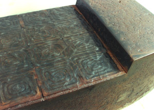 The two mirrors in this show were the same scale and format, but with entirely different personalities. Formally, the mirrors are unusual in that they are squares. But much more unusual is the proportion of the square of mirrored glass to the frame itself, hardly more than 10%, suggesting more a forbidden view than a place to review and arrange oneself. It is almost like the small window in the door of a private club. Beyond this, the personalities of the two mirrors could not be more different due to McKie’s bas-relief carved patterns. In the first, four snakes coil around the mirror. Their bodies are dramatically covered in gold leaf, which is augmented by red and black pigment. The second mirror, as self-effacing as the first is dramatic, uses a delicately carved vine motif with no color differentiation in the wood surface except for the shadow cast by the carving.