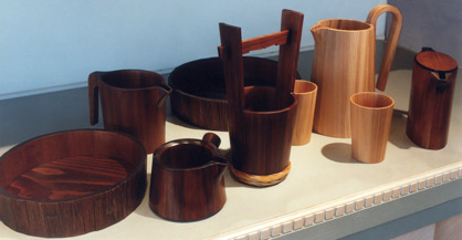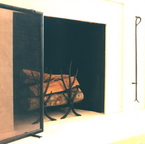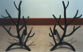 NOTES: The time line in the exhibition poster takes a look back pictorially at some of the work that debuted at the gallery during its first 20 years. The pictures surrounding the time line show many of the pieces contributed to the 2001 show. Typically, some work for the show was not ready in time for photography, like Janene Hilliard's Ivory Reed Lamp; Tom Hucker's apple wood low table; Tom Loeser's Rocker for Four, and Fran Taubman's forged steel Vine Console. Kristina Madsen's time intensive chest of drawers was finished later that summer.