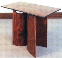 Fran Taubman's Vine Console would later appear in Architectural Digest. Tom Loeser's witty bench, Rocker for Four, was in fact a rocking bench and would accomodate four bodies by virtue of iridescently colored, gouged carved seating places. Tom Hucker's table blended the country charm of the material, apple wood, with his sophisticated sense of form, in this case, a triangle with curved sides and fin-like supports.