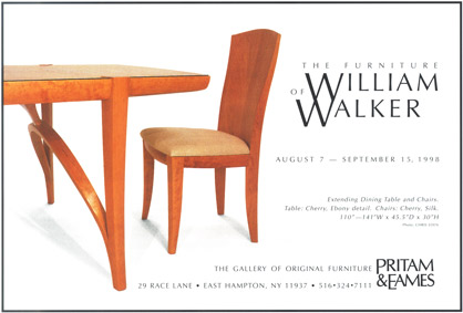 NOTES: This is William (Bill) Walker’s first one-person show and it ushers in the second decade for Pritam & Eames. It is also the first time the gallery has hosted a solo exhibit to someone trained by James Krenov. [Brian Newell, another Krenov-trained maker, will have his first one-person show in 2002.]