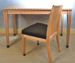 The second feature of this table is that the top is not just supported by four legs, but the legs are set into the top in such a way that they establish a dramatic design character for the entire table. By joining the legs at 45-degrees to the apron sides, they seem to stand proud of the apron and define the projection or extension of the table itself. This impression is augmented by their interesting shaping. Three forward facets create the surface that project out and into the room. The leg, itself, intersects with the table's apron with two larger facets which themselves join to define a corner of the eating surface. The part of the leg that faces towards the table’s interior is completed with a rounded section. At cross section, this is a complex shape. The three flat surfaces are flat only in their width, as these faces travel down the leg to its foot, the leg has a gentle saber curve. The crisp intersection of these facades is one of the table’s tailored features.