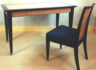 John Dunnigan's Bon Heure du Jour desk references earlier work of his with its tiered or stepped legs. This is strictly an elegant piece, without the use of exaggerated elements that mark his work of the late 1980's. His accompanying chair is in keeping with this piece, representing the essence of his best chair designs.