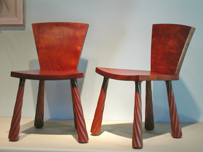 | SEATING @ Pritam & Eames Chairs, Benches, Stools - 2010 | SEATING @ Pritam & Eames August 6 - September 7, 2010 VIVIAN BEER . GARRY KNOX BENNETT . DAVID EBNER . MICHAEL HURWITZ . TIMOTHY PHILBRICK . JAMES SCHRIBER . HOWARD WERNER NOTES: There were a number of exciting seating pieces that arrived for this show, starting with Vivian Beer's Ruby Red Slipper Bench. Ruby Red Slipper was the first piece by Vivian Beer to be exhibited at P&E. Beer's father was a Maine boat-builder, and she had plenty of practical experience in the boatyard that gave her choice to bend and weld sheet steel into furniture forms, a rational base. That her slipper form has the fluidity of poured resin is still a thing of wonder, and shows the confidence of an artisan whose apprenticeship included working on parts for Jeff Koons’ sculptures. The gratifying sculptural aspect of her “slipper” is that it pours itself into the terminal of a cubist block, which anchors nicely the activity of the dancing form. Ruby red and black are essential to this bench. |