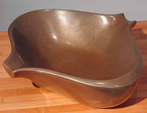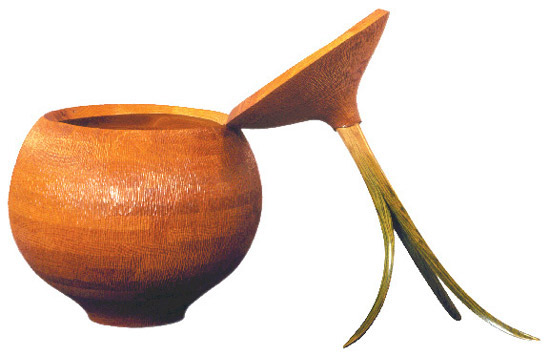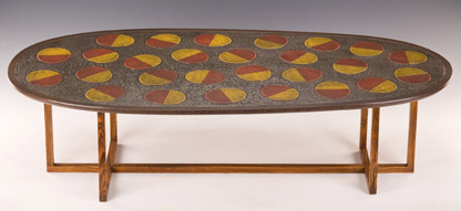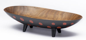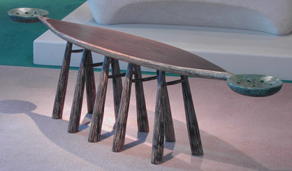 The Pod presents a long oval top supported by ten oar-like legs. Its tension is created by the gouge-carved scooping of the top surface, yielding the illusion that the gouge carved ball on one end is in constant commencing of its run towards the center. | |||||