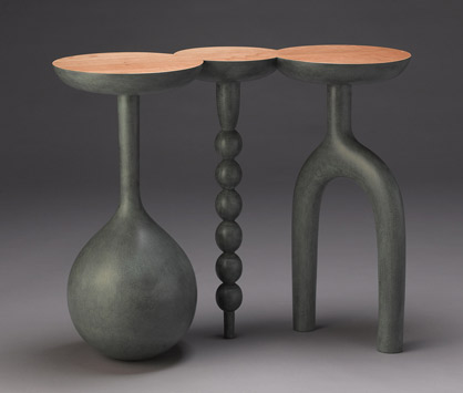| Stacked Table by JOHN ERIC BYERS: Mahogany, milk paint, forged iron. |