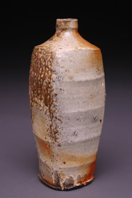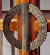 The Oval Cabinet by Brian Newell strikes one immediately with two features: the gorgeous East Indian rosewood panels that compose its closed front and, secondly, the elegantly tapered unusual oval cabinet form itself. The cabinet is not a true oval. The plan projection of its shape suggests a strongly squashed hexagon. That the six sides of this hexagon are pillowed creates the sense of an oval. In truth, its narrow ends are defined by a single vertical line from leg to crown. Three panels across the front and three panels across the back create the need for six legs and six vertical stiles to support its tiara-like top. Visually, Newell creates a weighted base in two ways: the legs define a slightly more shallow space than the vertical space of the top and the door panels themselves, become taller the lower their position in the cabinet. All in all, he has created an elegant cabinet form whose beauty is only heightened by the organic richness of the rosewood panels. And then, what a surprise when you open the cabinet door and discover the striking isu noki inside! | |||||