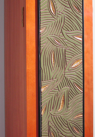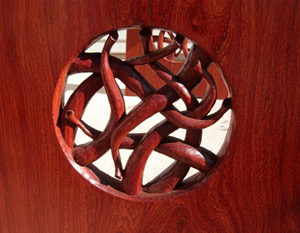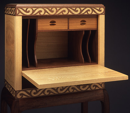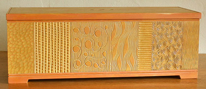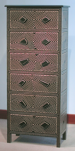 | NOTES: The chest-on-stand shown here began as a simple commission request: “I’d like a cabinet by Kristina Madsen.” Although the client had an idea of the scale of the cabinet he would like, he was content to leave the design ideas completely up to Madsen. And so with a notion of a cabinet-on-stand that she would like to make, Madsen began developing pattern ideas for the upper cabinet’s main façade, a process for her that typically begins with drawings and ends with test panels. Circles within circles: Madsen chose an animated dynamic in which some of the patterns would be revealed behind others. Before she started carving, Madsen sealed the bubinga with varnish. Once carved, she scrubbed in the gesso, wiping it off of the top surface with a damp rag. Once the gesso was dry, she lightly sanded the surface and applied a couple of more coats of varnish. The gessoed background helps to lift up/set off the primary pattern, which creates the illusion of greater dimension than actually exists. This visual depth is enhanced by applying dark brown gesso to the more complex background patterns. While the top-most pattern is composed of simple sickle shapes in bubinga, the pattern beneath is developed with curved lines and tooth-textured, ribbon-like sections. The syncopated activity of the different levels gives an illusion of endless action. The legs of the cabinet-on-stand were made to look like they were turned, but because of their gentle curve, had to be shaped round by hand. |