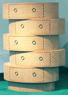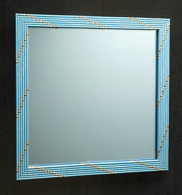 Alphonse Mattia’s Pencil Mirrors are a continuation of his witty mirror series that began in the early 1980s. From a distance, the frames have an almost Frank Stella appearance of a post-painterly color work. On closer inspection, however, the viewer is delighted to see that they are actually a composite structure made up of brightly colored number two pencils. Mattia’s simple technique of staggering the pencils created the optic dynamic through the brass and rubber elements of the erasers. | |||||