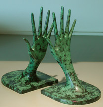 | You catch of glimpse of Judy McKie’s Tiger Table in the reflection of Mattia’s Yellow Pencil Mirror. This piece by McKie reasserted her strength in creating spirited animal figures in a way only suited to work in bronze. Observing the tiger, you are aware of its attitude immediately. Every gesture of this composition communicates with clarity an animal poised to challenge. The calligraphic mastery of line, the rounded curves of the under tucked tail, and the rounded cavern of the mouth are beautiful linear gestures, as well as unambiguous in their contained ferocity. The simplicity of the curve of the front legs feeds the tension of the tightly sprung curve of the rear. The tiger’s stripes, without being literal, identify the creature. This is a very strong piece that illustrates McKie’s ability to create emotional content without interrupting the fascination of an animal nature. |