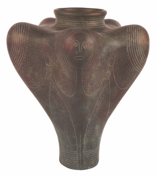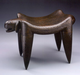 The Gazelle Table from Judy McKie was originally conceived in the early 1980s. At that time, she roughed out parts for several more of the edition, which were finished over the subsequent years. The table strongly suggests primitive animist work. The upright, sentinel position of the forequarters lends the piece its presence. McKie has often used “twinship” in animal form to create a symmetrical whole but also to raise to guardianship an animal form. Here the use of carved and colored bands to embellish the forms also adds to the heightened presence of this animist rather than animal form. |