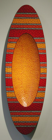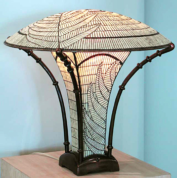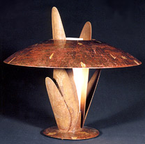 Four pieces by Don Miller show well the range of his thinking on the form and pattern created by skeletal and surface piecing. Starting with his wall-hung demilune, and looking at it structurally, each horizontal surface member is supported by an arched rib joining in the belly of the piece with a result of lightness and strength. Pattern-wise, each piece doubles as a perspective line converging at the edge of the plane. It is easy to understand how helpful an advanced computer design program would be in figuring out the shape of an individual piece. This is what Miller did. His mirror uses similar design thinking but adds a more playful aspect. It is human nature to glance at a mirror when passing. Here the form of the piece is infused with mirror reflected light which ripples with shadow effects as one passes. The Eggo wall vessel is the third piece that fits into this design thinking. Here form is used non-functionally; it makes you think of a spirit or energy hole but also brings to mind that Miller worked with musical instruments earlier in his career. In the fourth piece, his Tea Table, east meets west. A familiar pedestal design is partnered with a fan-pieced top. The graphic of the top suggests both a chrysanthemum form as well as the sun. |