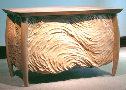 Carved Cabinet by KRISTINA MADSEN Bubinga, Indonesian rosewood, maple, gesso, silk. 47.25”H x 22.5”W x 14”D Photos: David Stansbury |