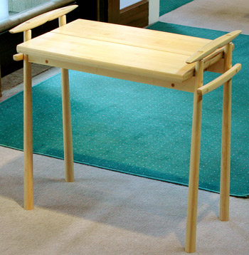 Howard Werner, well-known for his fine sculptural chain saw carving, has also made a strong use of hard edged geometric forms in his work. This low table made of pine is formed by two adjoining, identical members. They are mirror opposites and can be adjoined on any of their five vertical facets. |