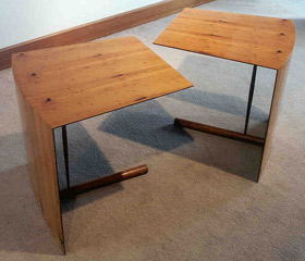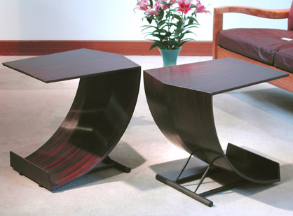 | Side Tables by WILLIAM WALKER: Kerilian/Masur birch, fiddleback maple, cocobolo. |