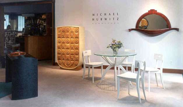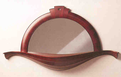 MICHAEL HURWITZ: Furniture NOTES: Michael Hurwitz's work always maintains an innovative structural dimension, a defining characteristic that he attributes to the early influence of his teacher, Jere Osgood. You can also detect the influence of another of Hurwitz's teachers, Dan Jackson, in the mirror he made for this show. The hemispherical mirror is joined to a mantle shelf built into a form of an oxbow curvature. And like another of his teachers, Alphonse Mattia,whose mirror series became his signature work, Hurwitz chose to treat the mirror as a major piece in this show. |