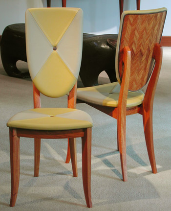 Michael Hurwitz uses the shield shape as an element of design in the back of his chair. However, the back is sufficiently narrow that this form appears in an elegant way, and is embellished on the sitting side by a subtle graphic that uses two closely related tones of mustard and taupe leather. The chair’s width is projected to the front edge of the seat, which in characteristic Hurwitz manner, gives it a welcoming gesture. |