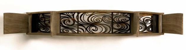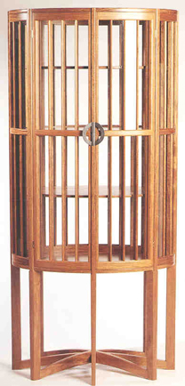 | Looking to the China Cabinet, you are struck by its spare, linear quality. The richness here lies in the details and Hurwitz's understanding of the power of restraint: the Damascus iron pulls, the axis of the mullions radiating from a central point, the antique glass, and, once again, in the base and the intersection of four arches. Oval in shape, it shows Hurwitz's fascination with the caged form. You think of his earlier Tea Cup Desk and his lattice supported chests. He once included a large bird cage in one of his shows at the Peter Joseph Gallery in New York. |