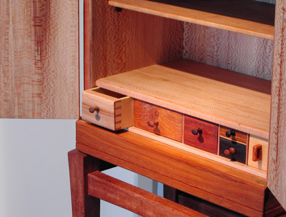 This beautiful chest of drawers in figured makore is a study in quiet elegance by a gifted furniture maker, Tim Coleman. Standing back from the piece, its vertical progression tightens as it moves to the top. It does this in two ways: each drawer is progressively shallower than the one below, while the vertical stiles of the frame have a slight curve toward the center of the piece as they progress upwards. At the base, it is clear that the curve begins as a diagonal outward thrust. By the time the stile reaches the top of the drawers, it has assumed its role as a corner joint in the chest’s rectangular top. Note how the posts of the airy crown are set as a square projection from this point. This airy crown on the chest is a nice solution for our visual expectations. The progression last described leads one to the expectation of a crown and Coleman has produced a proportional, yet airy, exhibition space. It has enough height for small vases and the four posts lend a protective character. | |||||