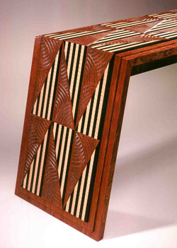 | Hall Table: Curly maple, maple, ebony, marquetry woods. |