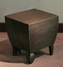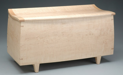 In a 2007 show, Brian Newell created a blanket chest that was rectilinear in form whose surface was covered by pillowed tiles of African blackwood. That chest featured a base of many legs. For the blanket chest in this show, he bellied out the front and back of the form, curved the sides and canted them towards the top, and used eight legs at the base to raise the structure. |