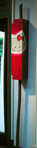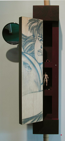 NOTES: Though she would exhibit an occasional piece at Pritam & Eames over the years, Wendy Maruyama's work was not a major presence at the gallery since her two person exhibit with Ed Zucca in 1983. Both artist and gallery thought it was time to remedy this. Maruyama was ready with an idea that had been germinating since the 1990s for a new body of work. The Turning Japanese cabinet series juxtaposes icons of Japanese pop culture like Hello Kitty paraphernalia, a Harley Davidson motorcycle mirror, female warriors and Godzilla figurines, Devilman comic book series, and "hentai" (Japanese slang for perverted) comic books with antique prints of samurai, women in kimonos, temple gardens, and images of the great Kamakura Buddha.
