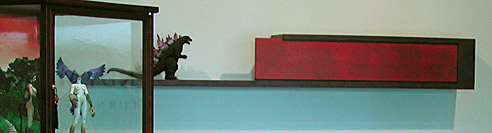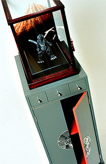 "King of the Monsters" Cabinet by WENDY MARUYAMA: Polychromed mahogany, quarter-sawn white oak, photo-etched stainless steel, glass, digital images, figurine. |