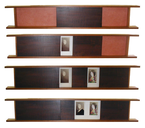 "Angry Asian Women" Cabinet by WENDY MARUYAMA: Polychromed mahogany, quarter-sawn white oak, laser-etched stainless steel, glass, digital images, figurines. |