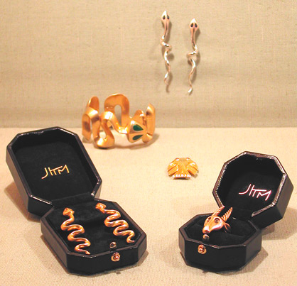 EARLY SPRING SHOW 2002 John Eric Byers, Linda Sue Eastman, Hank Gilpin, Julie Godfrey, Thomas Hucker, Mary Little & Peter Wheeler, Gary S. Magakis, Jere Osgood, Timothy Philbrick, Fran Taubman, Rick Wrigley NOTES: John Eric Byers continues to evolve his carved and milk painted cylindrical forms, and Thomas Hucker continues his inspired forms in this pair of cantilevered end tables. Osgood's Easy Chair is joined by a companion settee. The outstanding wood piece in this show is an oval dining table in cherry from Hank Gilpin. The Arts & Crafts flavored pedestal has a frame-and-panel core, the corners of which have a 45 degree facet. This allows for jointing at the bottom to the horizontal S-curved legs. From its oval top, which is rounder than the usual oval, through the use of figured wood in the panels of the pedestal, to the generous strength of the legs, this piece exhibits the best of Gilpin's fresh touch with standard design elements. In metal, Fran Taubman's Thicket Table takes her a step away from her previous Art Nouveau inspired work that the Branch Lamp represents. The forged steel branches in the Thicket Table leave the floor in a swirl of thrusting energy, giving this piece a dynamic center. The cast bronze Celery Table by Jod Lourie adds sculptural interest from a newcomer to the gallery. |