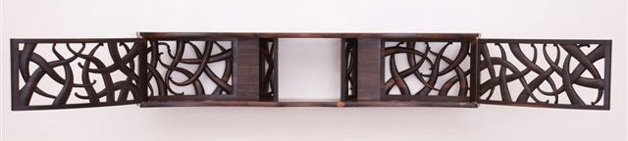 There is a pierced carved grillwork in the center of the Thorn Cabinet that holds the first look. It is carved through in a pattern of thorns. The cabinet sits on a proportionately tall stand, its eight legs descending without curve to their small eggplant-shaped feet. The effect is to have the cabinet itself sitting high as if in an aerie world all of its own, while projecting by means of the bottom leg stretchers a floor plan of the building above. And the sense of that cabinet is cathedral, with a central nave and left and right transepts.