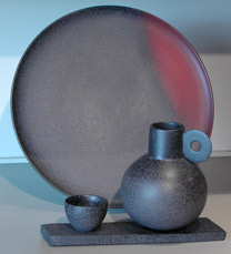 Also included in this exhibit were two collaborative pieces with Yuji Kubo, the Japanese lacquer artist: the polychromed floor-standing lamp, and the amber and black Inkstone Desk with its wondrous rubbed-out pine needle pattern. |