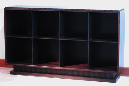 This “pocket” library was commissioned of James Schriber as part of a complete renovation -- design as well as structure -- of a traditional house on Shelter Island, NY. The re-design carefully adopted architectural elements that would blend into the company of its traditionally styled neighbors. In this way, this library unit also reflects elements of the new and the old. This is another good example of how Schriber’s talents allow him to absorb the environmental circumstances in a space, and come up with a specific design. The clients had also admired a late-1980’s circular library or foyer table of Schriber's that they had seen at the gallery. It has the neo-classical sense of a Deco design with silver leaf and ebony details. |