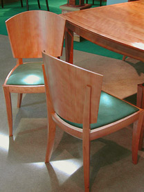The Pinto coffee table in white oak, and the upholstered bench have smoothly sophisticated forms. The Pinto's top is a witty parquetry design that could have originated with Dr. Caligari. The soporific green stacked balls-on-a-pole legs of the upholstered bench are kept in rigid tension by an iron stretcher with a spherical center. | |||||